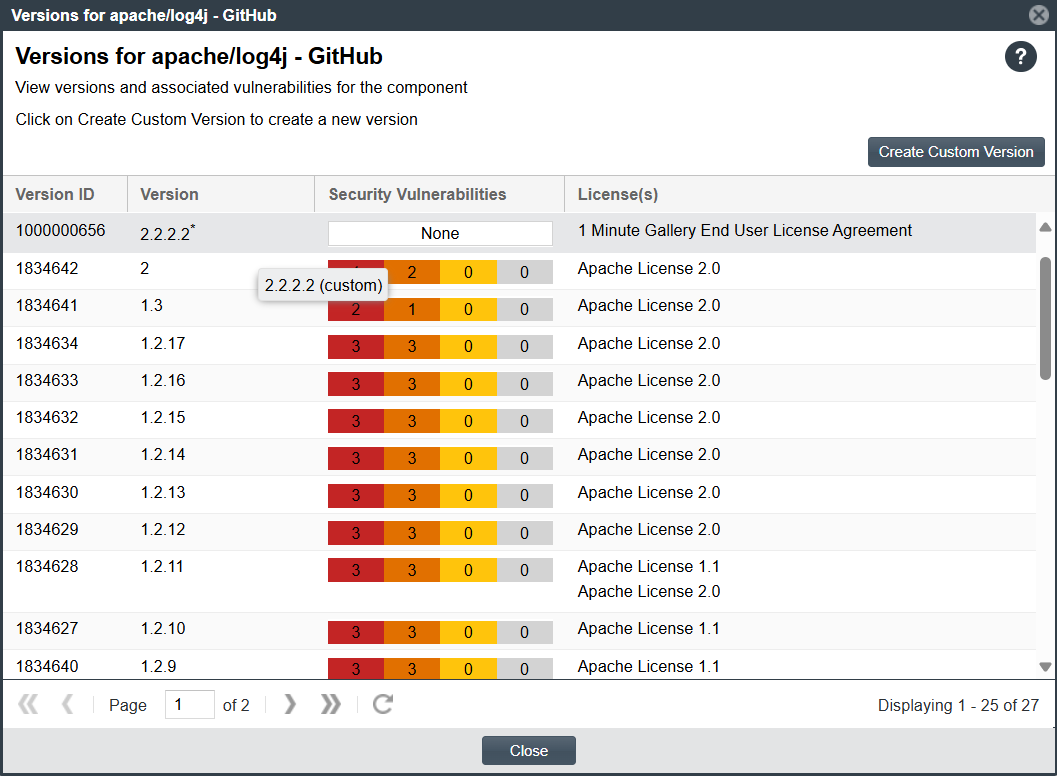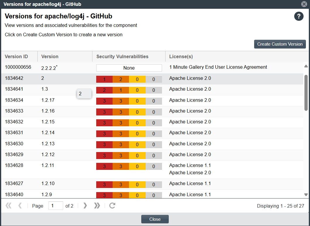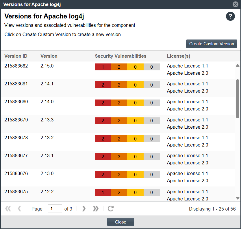 Viewing Component Versions, Version IDs, Licenses, and Security Vulnerabilities