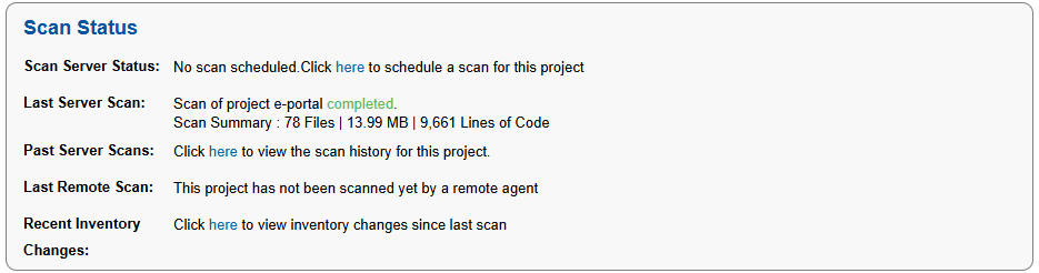 - Monitor the scan’s progress by clicking the “here” link in Past Server Scans to obtain information about scheduled, active, and past scans on the project. You can also monitor the scan in the Jobs queue (see Monitoring the Code Insight Jobs Queue). Note the following: