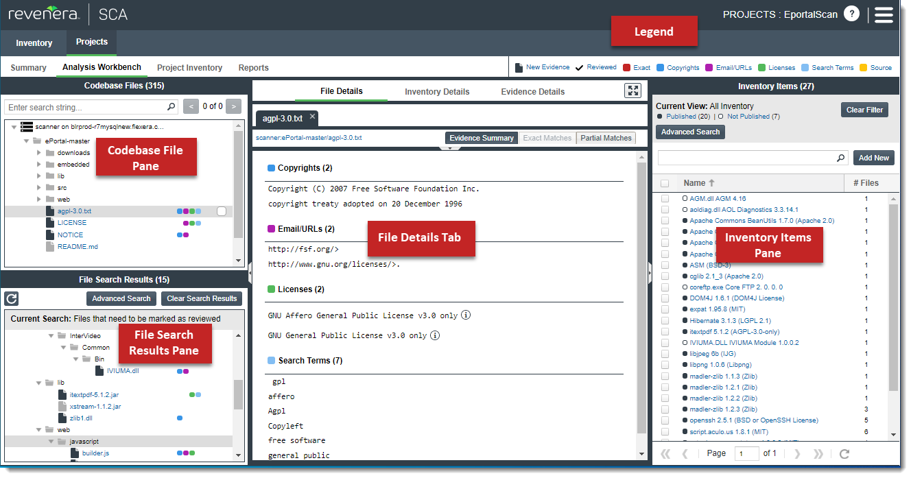 The Code Insight ProcessAnalyzing Scan Results in a ProjectOpening the Analysis WorkbenchThe Analysis Workbench LayoutThe Analysis Workbench Layout The following is a view of the Code Insight Analysis Workbench , showing the various areas of the page.
