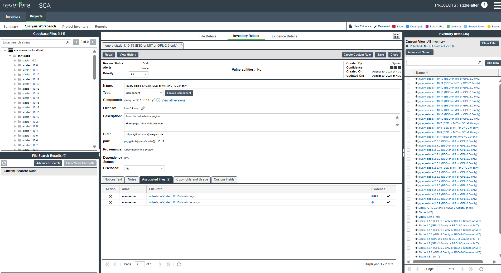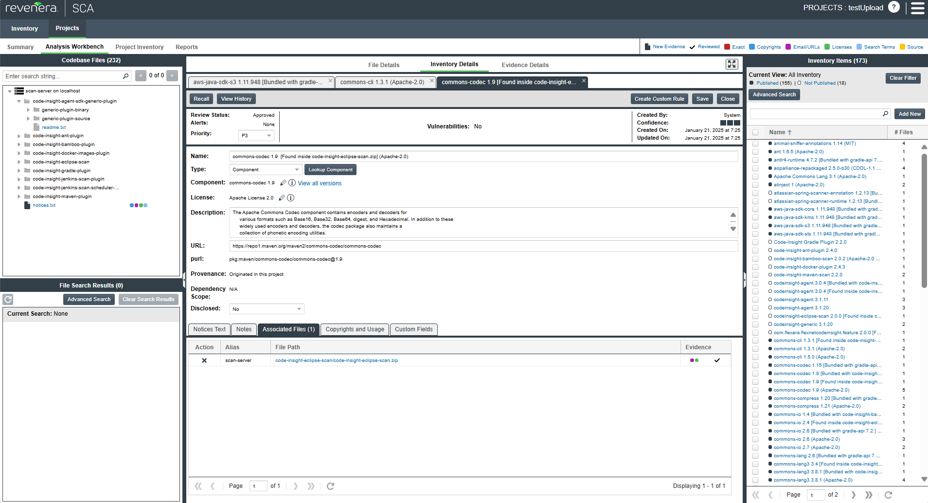 The scanning of codebase files will not generate inventory items that have a matching CVL (Component Version License). However, if multiple inventory items with the same CVL are generated during scanning, these inventory items will be merged with an existing inventory item that has the same CVL, based on the recent updated timestamp of the inventory items. This process updates the Relationship field values, indicating whether it is Parent Inventory or Child Inventory and the Dependency Level field values, specifying whether it is Top-level , Direct , or Transitive on the Project Inventory Details pane—for the existing inventory item. It also updates the file associations in the Associated Files tab—both on the Project Inventory Details pane and on the Inventory Details pane in the Analysis Workbench —for the existing inventory item.