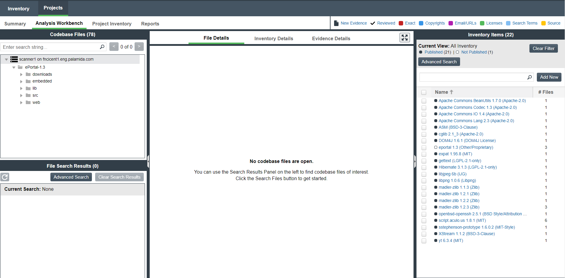 When you scan codebase files with the first and transitive level scan profiles, a list of inventory items without dependency tags is generated. The following displays a list of inventory items without dependency tags in the Inventory Items pane on the Analysis Workbench :